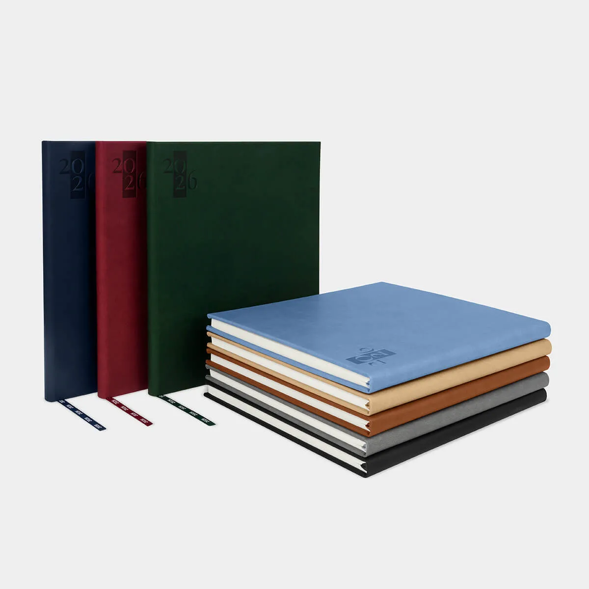 Agenda semanal con 80 hojas. Contiene datos personales, calendarios 2025-2026-2027, planeador 2026, presupuesto de gastos, seguimiento de nuevos hábitos, organizador de tareas, planeador de proyecto y días festivos. Incluye caja individual.