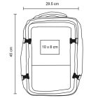 Mochila con compartimento principal, dos bolsas internas con cierre y resortes, cierre extensible, tres bolsas frontales, compartimento trasero para laptop de 17″, cierre para ampliar la capacidad, broches laterales ajustables, respaldo acolchado, banda carry-on, asas superior y lateral.