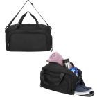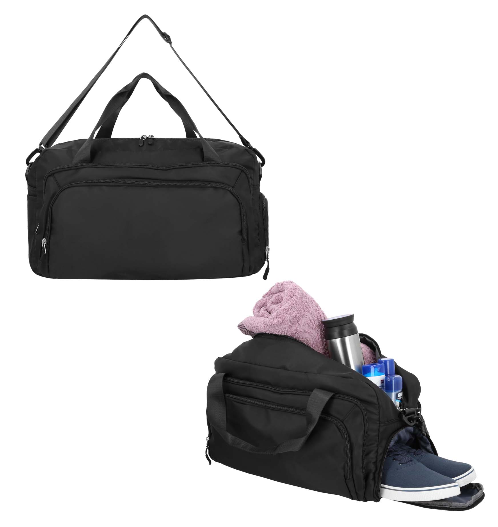 Maleta con 1 compartimento principal, 2 compartimentos frontales, zapatera, 1 compartimento lateral y asas.