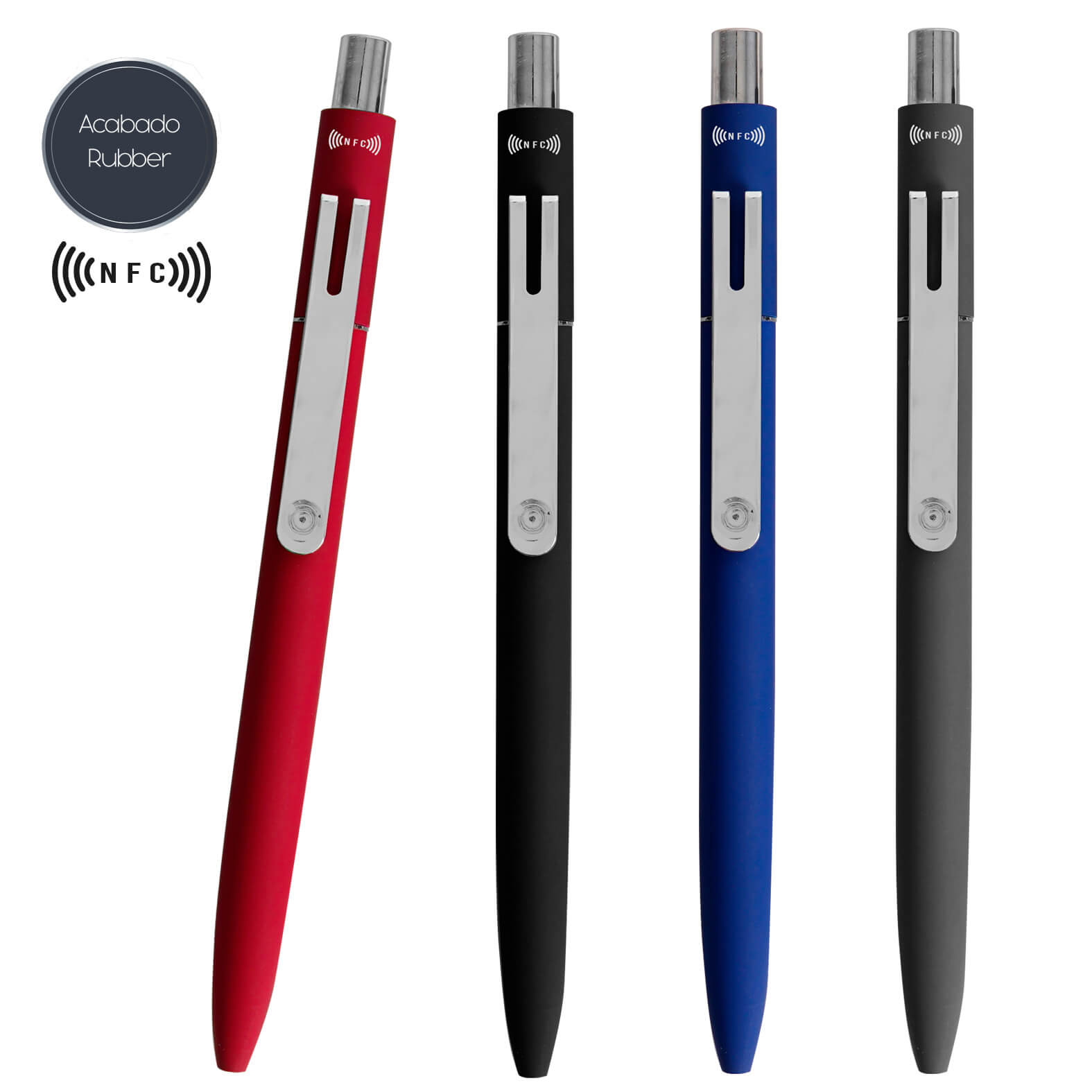 Bolígrafo metálico con acabado rubber y etiqueta NFC integrada, ideal para conectar con el mundo digital. Compatible con teléfonos inteligentes NFC, permite almacenar un enlace para acceso rápido a información, sitios web o contenido exclusivo. Cuenta con mecanismo de click y clip metálico.