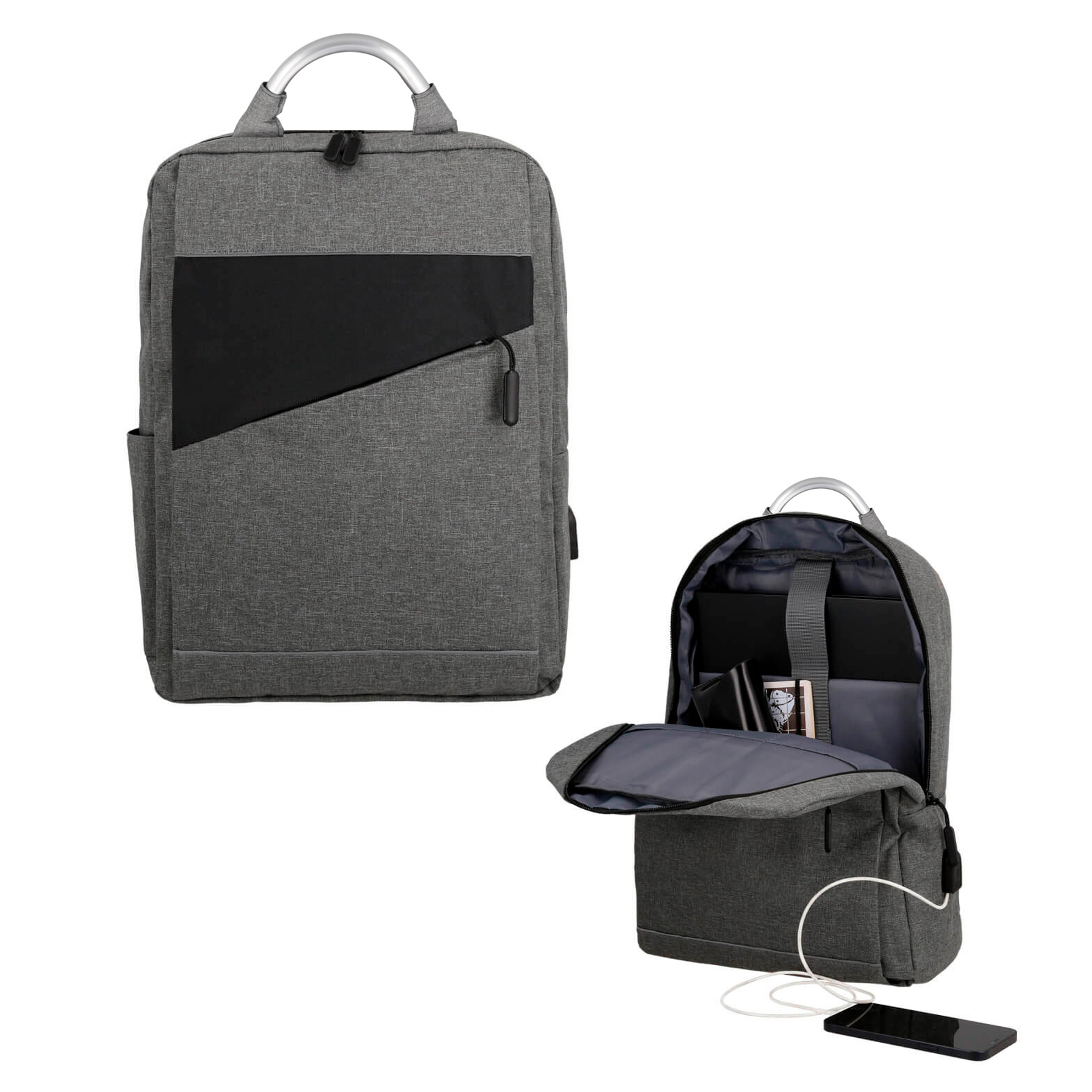 Mochila de 1 compartimento con porta laptop, organizador interior, entrada lateral de batería portátil, 1 bolsa frontal con cierre, tirantes acolchados y asa metálica superior.