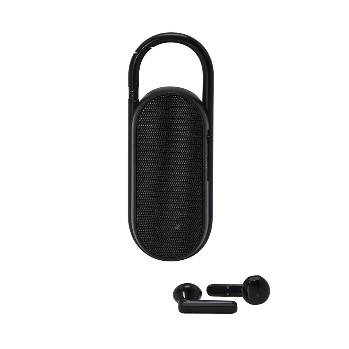 Bocina con audífonos bluetooth integrados. Pueden utilizarse ambas funciones al mismo tiempo. Controles integrados touch para volumen y reproducción de audio. Rango de conexión 10 metros. Asa integrada tipo gancho para transportarla fácilmente. Incluye cable cargador USB.