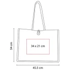 Bolsa con fuelle y asas redondeadas. Interior plastificado. Botón de madera al frente para cerrar.