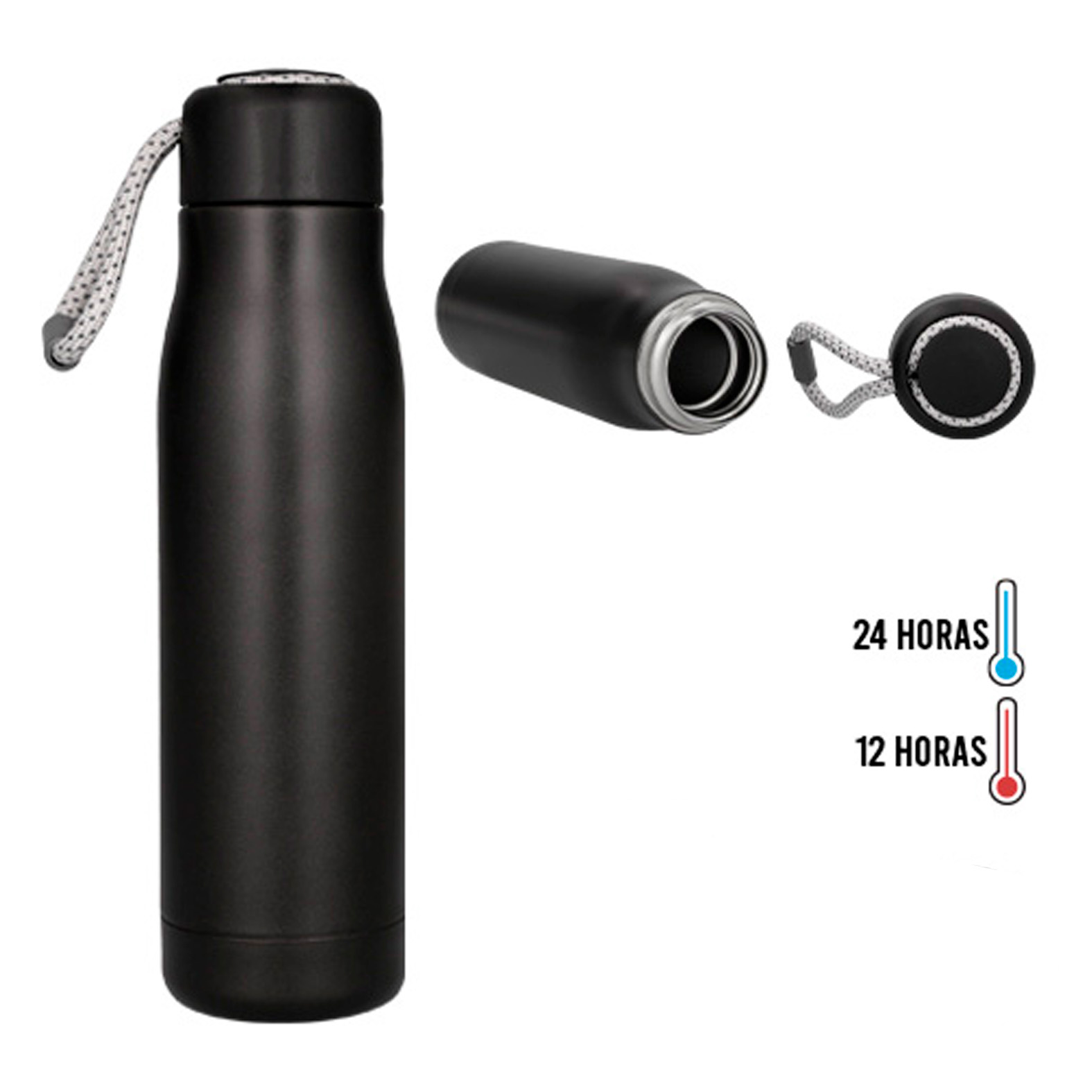 Termo con doble pared de acero inoxidable, con tapa enroscable plástica y correa de poliéster.