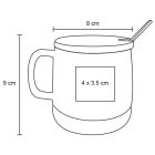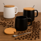 Taza de cerámica acabado mate con tapa de bambú. Incluye cuchara de acero inoxidable.