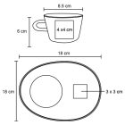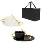 Taza de cerámica con cuchara de acero inoxidable y plato de cerámica.