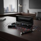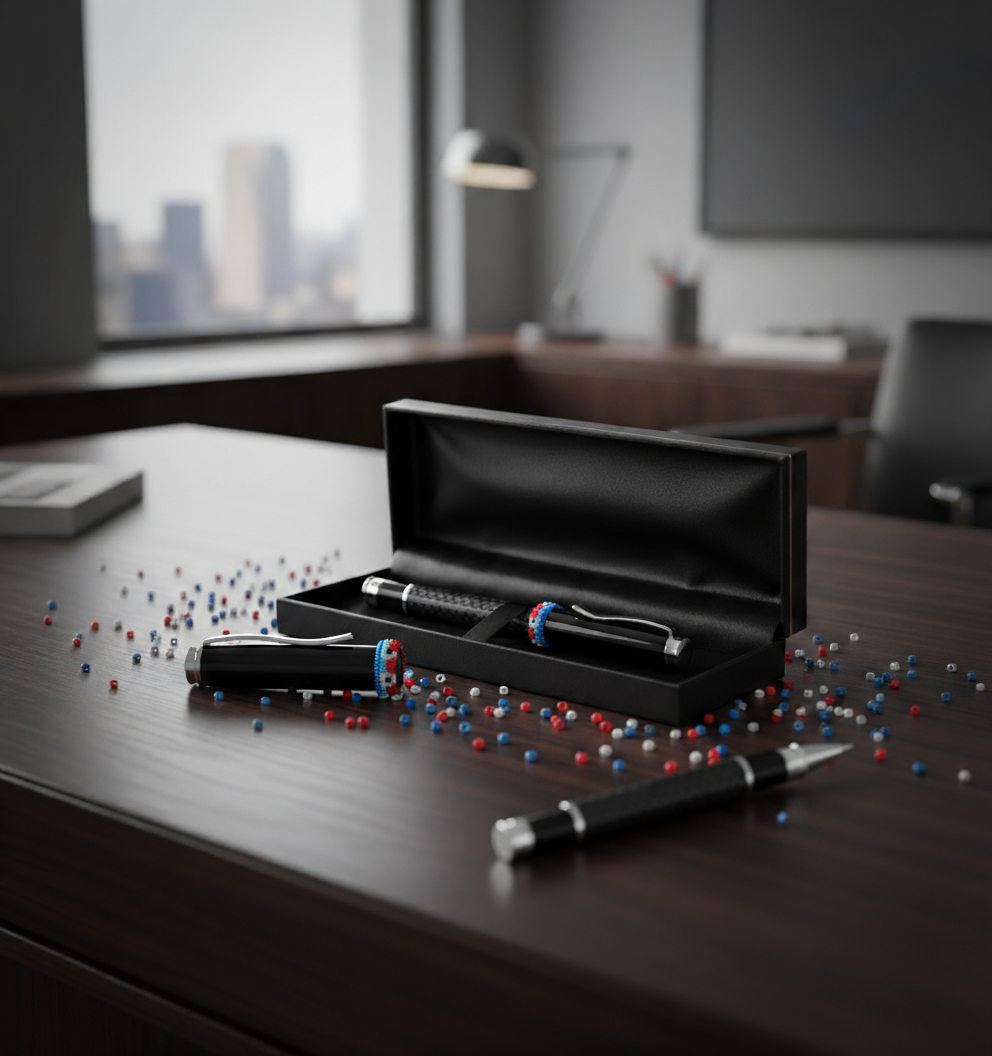 Bolígrafo de fibra de carbono con tapa metálica y estuche, decorado con arte huichol. Cada pieza está elaborada a mano con 120 chaquiras colocadas una a una por artesanos de Jalisco. Con cada compra apoyas el trabajo que representa el sustento económico de estas familias artesanas.
