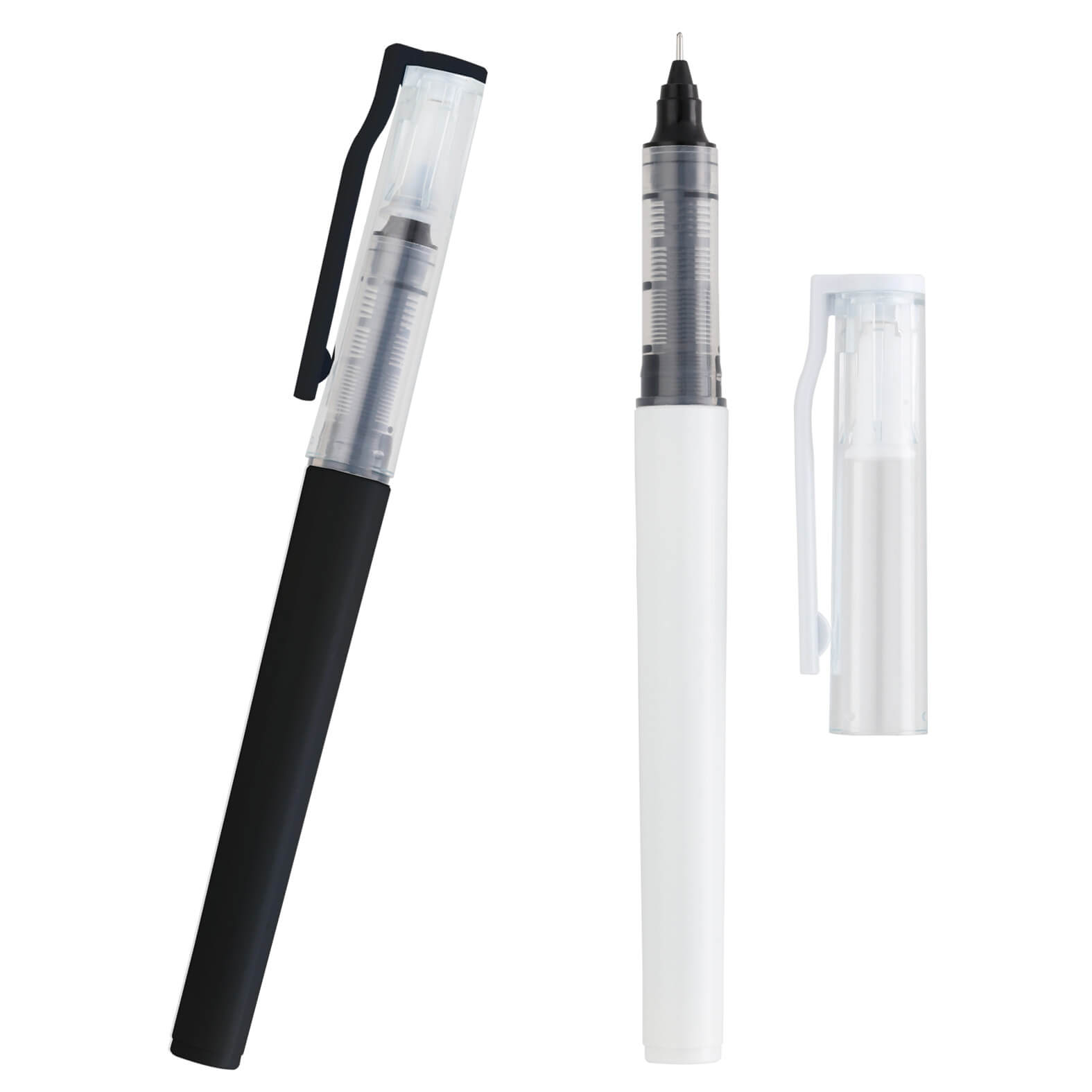 Bolígrafo de plástico con tinta negra de gel, tapa traslúcida y clip de plástico.