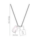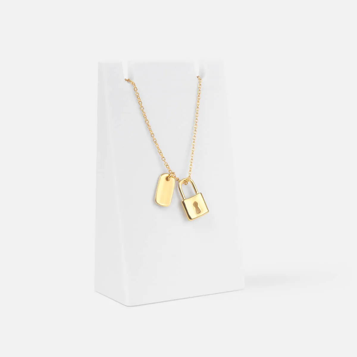 Collar con dije en forma de candado. Placa para grabado. Cadena base de latón de 45 cm + extensión de 3 cm, ambos con chapa de oro de 1 g. Dijes y placa de marca fabricados en metal zamac, también con chapa de oro de 1 g. Instrucciones de cuidado: Limpiar con un paño seco. Evitar contacto con el agua o productos químicos. No dormir, ni bañarse con la pieza. Incluye caja individual.