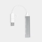 Concentrador acabado metálico con 3 puertos USB y 1 puerto tipo C. Soporta transferencia de datos. Cable de conexión con USB y tipo C.