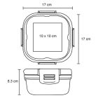 Contenedor de alimentos de plástico con 2 niveles, 1 parte superior con 3 compartimentos y 1 mini recipiente, 1 parte inferior onda, cierre hermetico con 4 broches de seguridad y compartimento para cubiertos.
