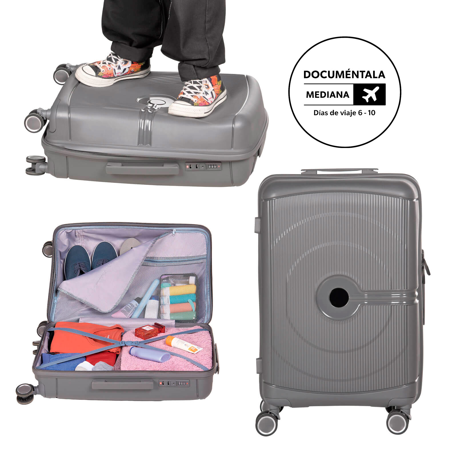 Maleta de polipropileno, resistente a golpes, ideal para viaje. Cuenta con doble rueda giratoria, asa metálica retráctil y candado de seguridad.