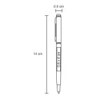 Bolígrafo metálico de diseño delgado con detalles plateados, clip y mecanismo retráctil.