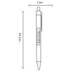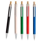 Bolígrafo ecológico elaborado a partir de papel reciclado. Cuenta con clip metálico y mecanismo de click con botón de madera.