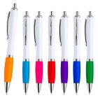 Bolígrafo de plástico con clip metálico y grip de goma.