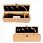 Set para vinos de bambú con 4 accesorios: Incluye sacacorchos, boquilla, corta gotas y corcho metalico.