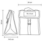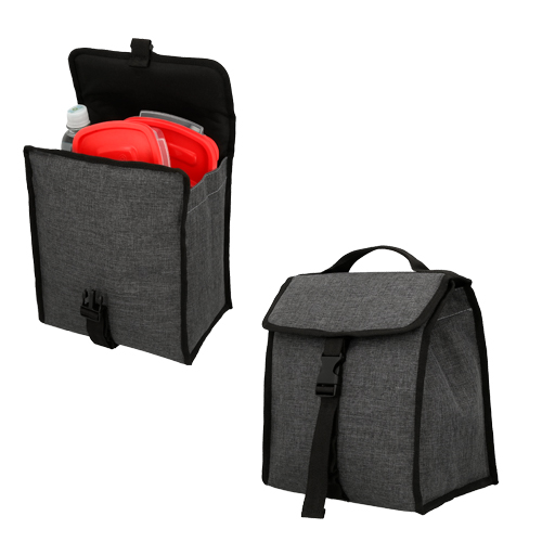 Lonchera con interior plastificado, cierre de broche, asa superior y fuelle en la base.