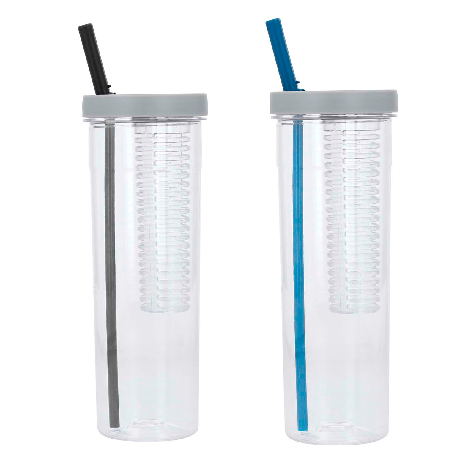 Cilindro de plástico con infusor de frutas y popote.