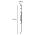 Bolígrafo libre de tinta con goma y touch screen. El trazo gris simula la línea de un lápiz, cuenta con una aleación de metales entre el estaño y bismuto, que al contacto con la hoja y la fuerza aplicada hace una reacción química de oxidación, no deja manchas y es posible borrarlo con una goma regular, la cual está incluída al destapar la parte superior del bolígrafo.