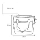 Hielera de poliéster con interior impermeable plastificado, 2 asas con broche de velcro, 1 correa ajustable, 2 compartimentos de malla laterales y 1 compartimento exterior con cierre.