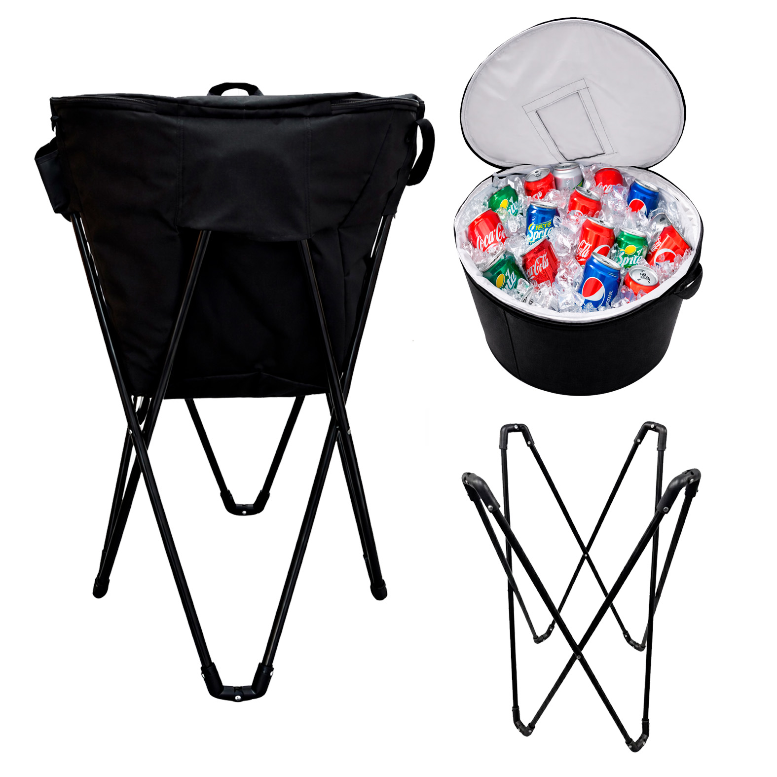 Hielera con interior impermeable, cierre y ventana con velcro para fácil acceso en la parte superior, asas y soporte de metal plegable.