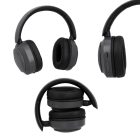Audífonos plegables bluetooth de plástico que incluye función de manos libres, control de llamada, volumen, reproducción de audio, botón de encendido y apagado, entrada para tarjeta micro SD y auxiliar. Incluye cable de carga tipo C.