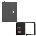 Carpeta de poliuretano con cierre de broche, porta tarjetas, hojas rayadas y arillo metálico.
