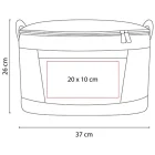 Interior plastificado impermeable. Bolsa principal con cierre y bolsillo frontal. Incluye asa y correa ajustable. Capacidad para 26 latas.