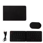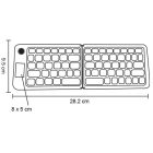 Teclado inalámbrico plegable con botón de conexión. Incluye soporte y cable de carga.