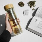 Termo con doble pared de vidrio e infusor, colador de metal y tapa de bambú enroscable.