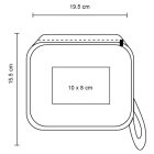 Cosmetiquera rectangular de plástico con frente transparente, cierre y asa.