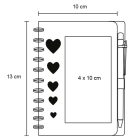 Libreta de cartón con figuras de corazón, espiral, 70 hojas rayadas y bolígrafo.