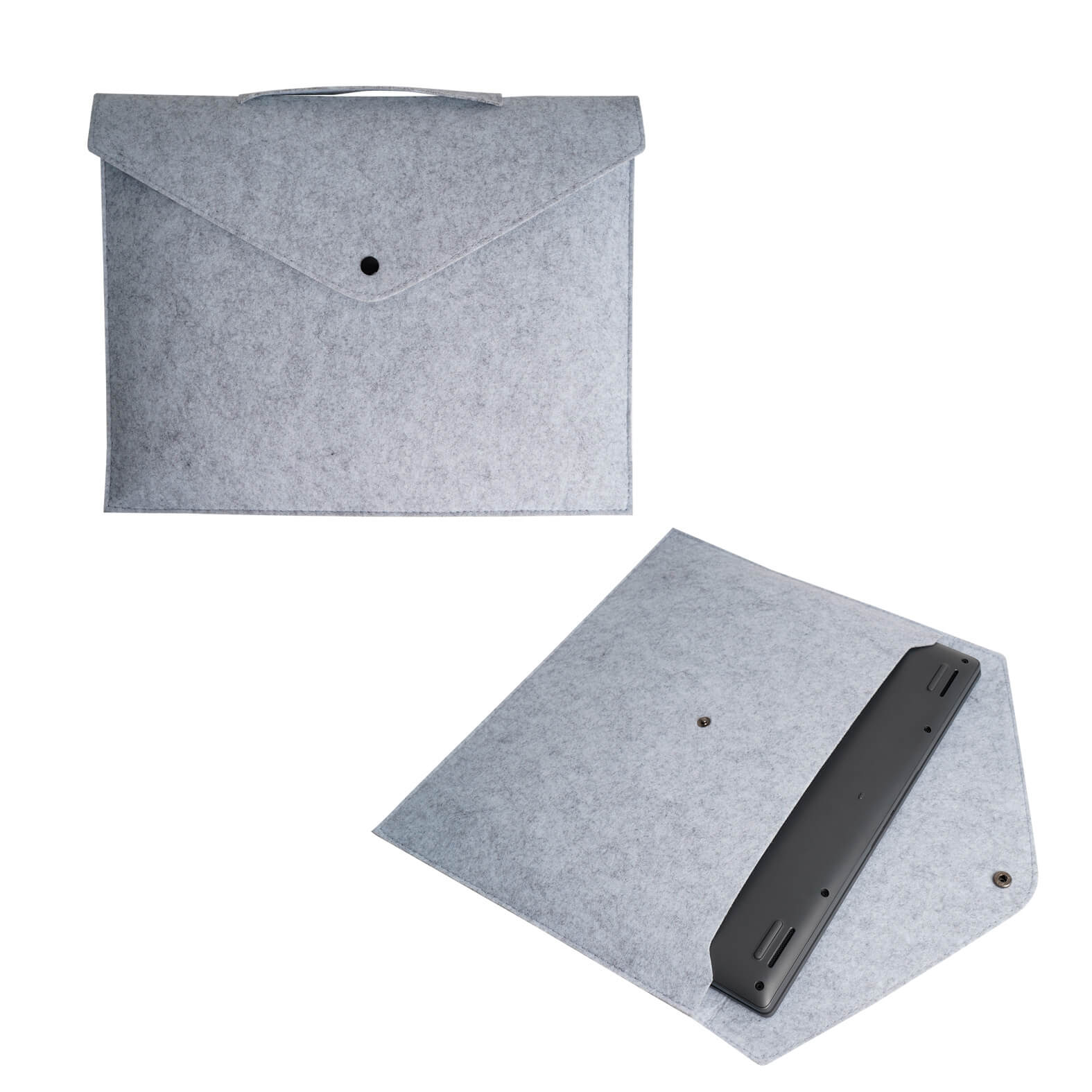 Portafolio de fieltro con un compartimento principal para laptop de hasta 15″ con broche y asas.