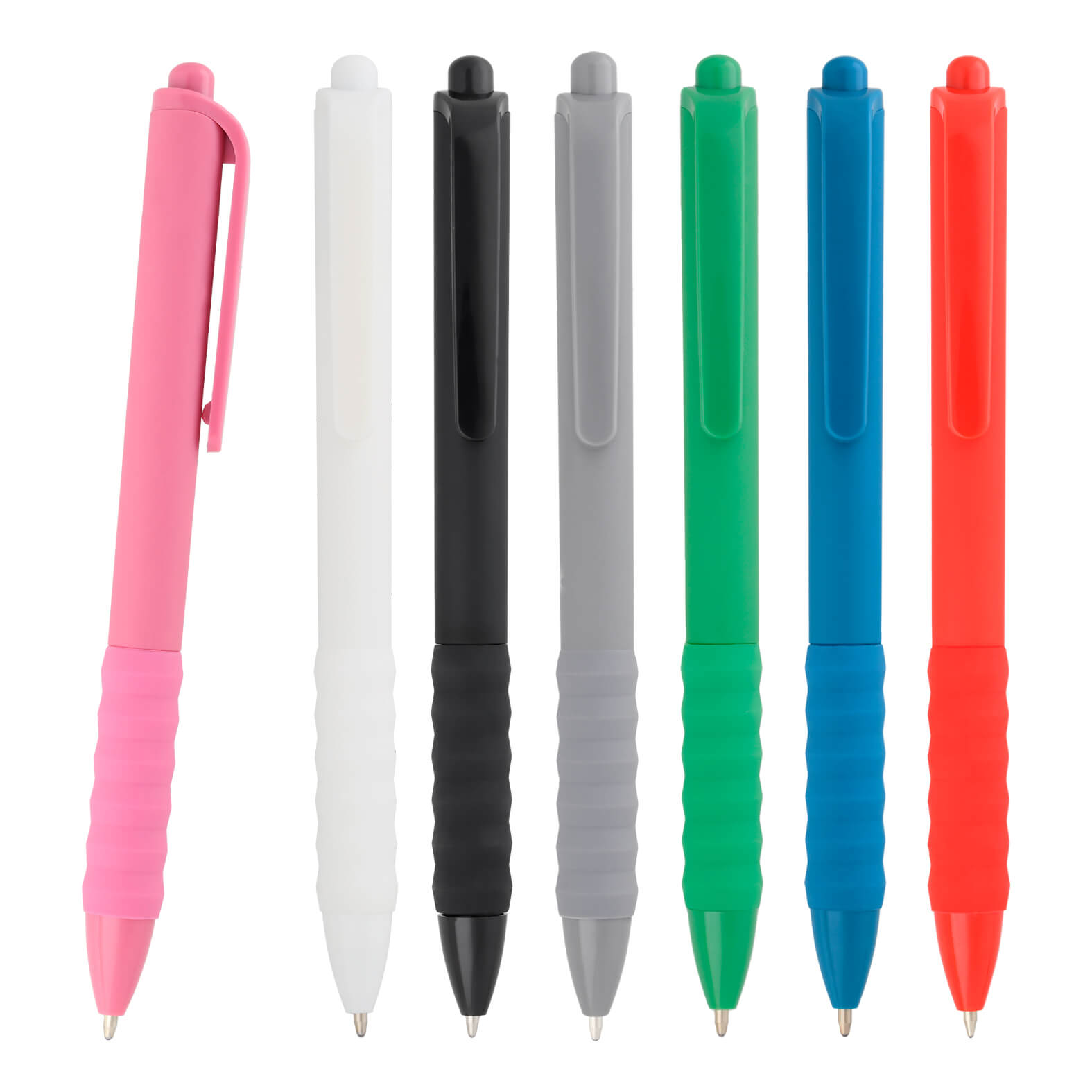 Bolígrafo de plástico con acabado rubber, grip de silicón y mecanismo de click.
