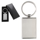 Llavero metálico de placa solida en forma rectangular con arillo reforzado.