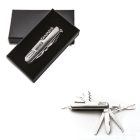Navaja metálica multiusos con 11 funciones que incluyen: desarmador, tijeras, destapador, navaja, sierras y sacacorchos, cuenta con arillo para usar como llavero y caja de regalo.