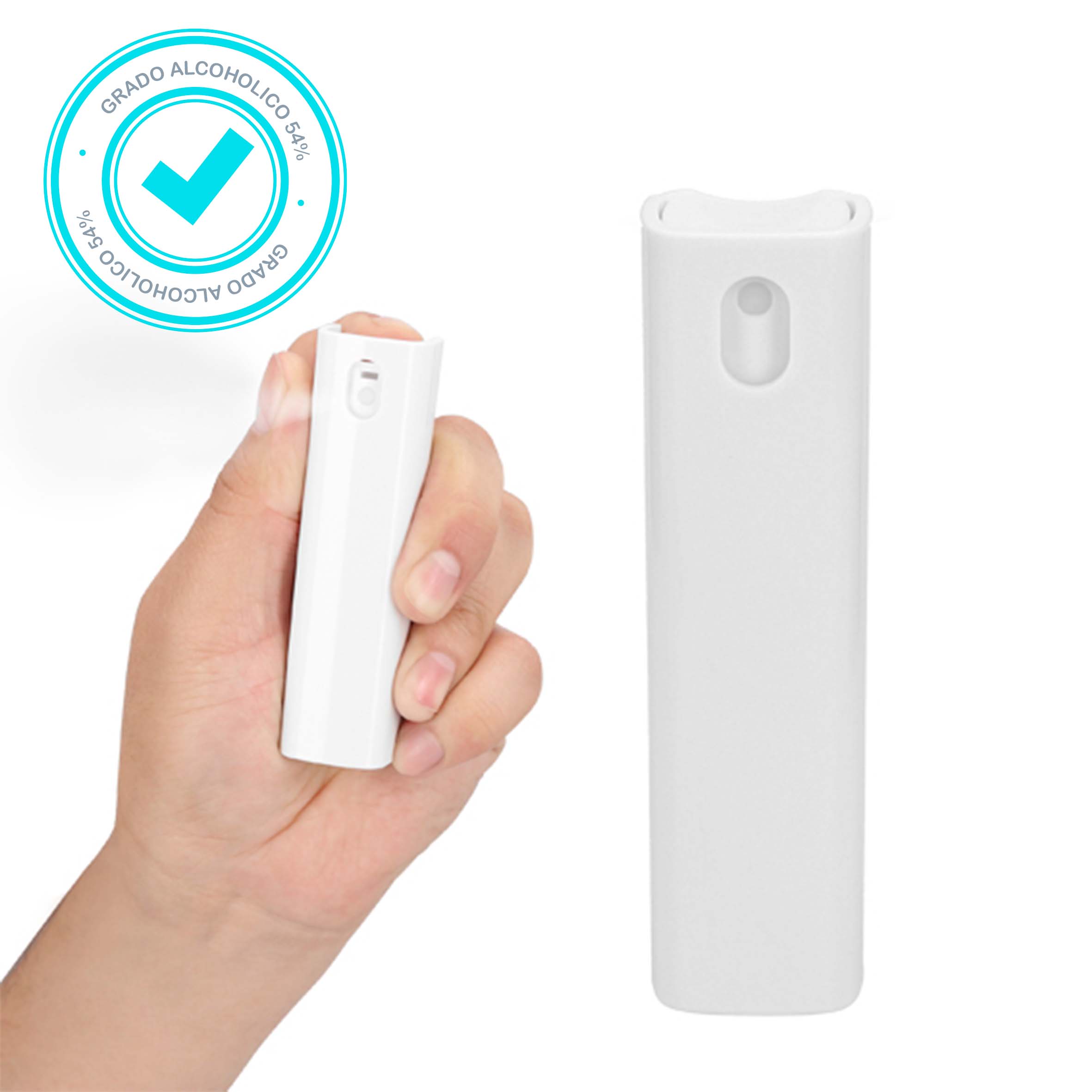 Gel antibacterial en spray reutilizable con tapa enroscable y estuche de plástico.