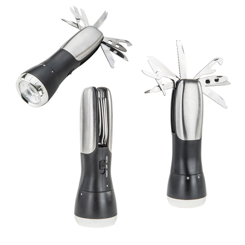 Lámpara de cinco LEDS con flash y navaja de 8 funciones: destapador, navaja 2 sierras, desarmador, tijeras y lima, utiliza tres baterías AAA ya incluidas.