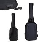 Bolsa de hombro con carcasa dura, compartimento principal de apertura 360°, puerto USB, organizador interno, candado de seguridad, asa superior, tirante con bolsillo con cierre, correa ajustable y respaldo rígido con bolsillo con cierre.
