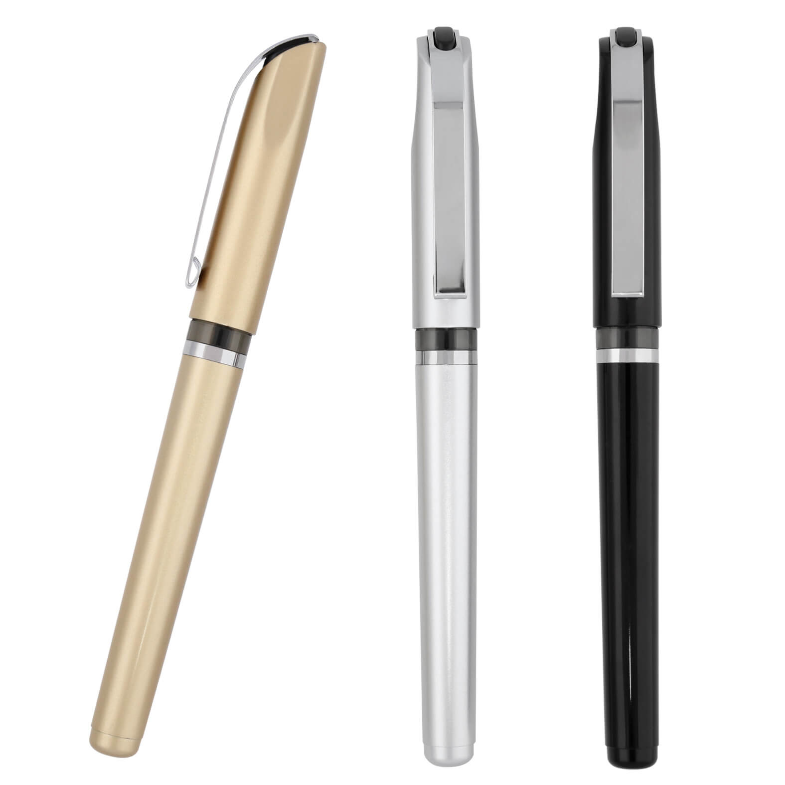 Bolígrafo de plástico con apariencia metálica, tinta gel y clip metálico.
