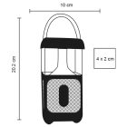 Bocina Bluetooth portátil con luz cálida/fría y botones para ajustar los niveles de intensidad. Cuenta con lámpara con luz de emergencia, botón de encendido, radio FM, puerto USB y TF. Incluye cable de carga tipo C.