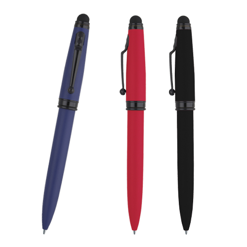 Bolígrafo metálico en acabado mate, clip, goma touch screen, detalles en color negro y mecanismo retráctil.