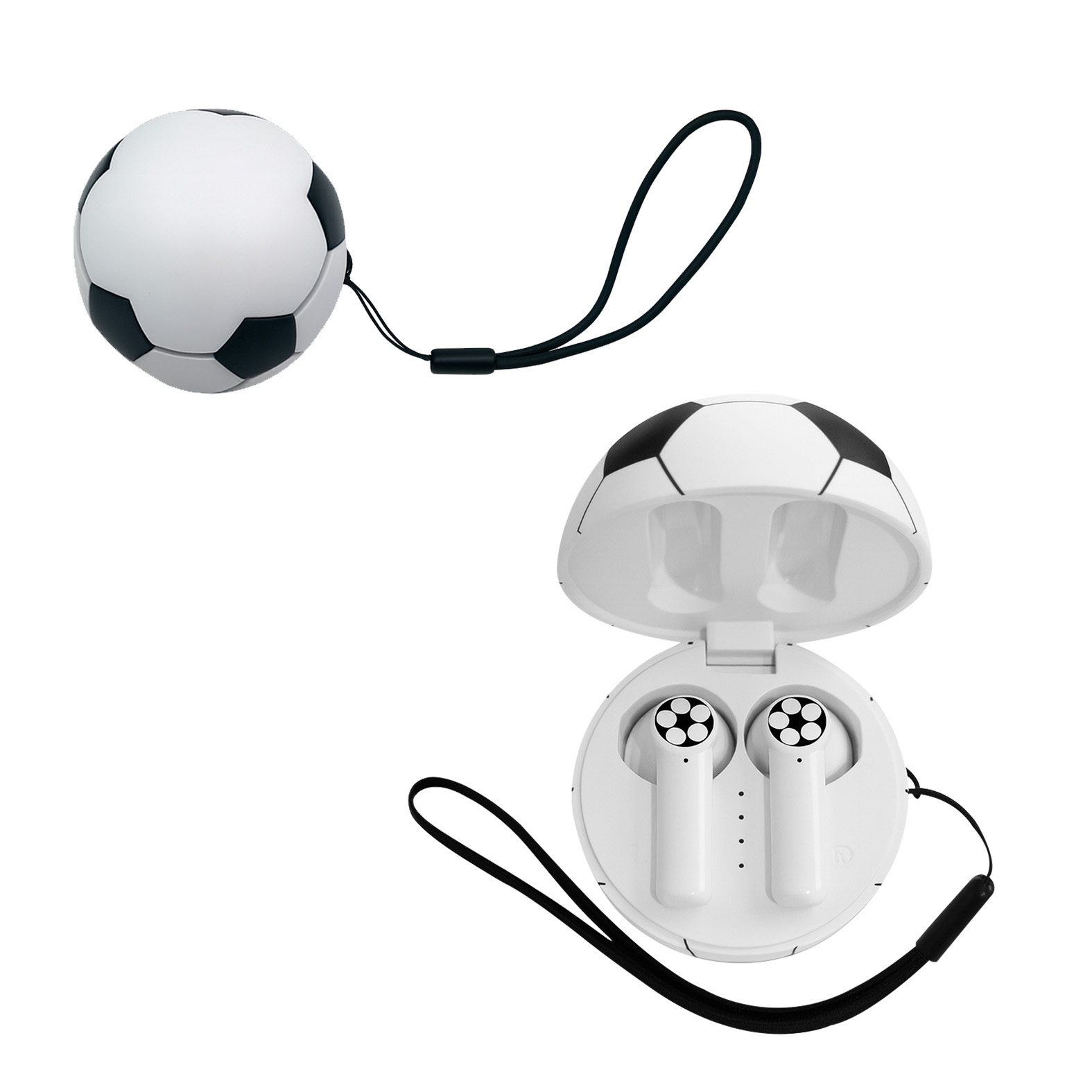 Audífonos Bluetooth con con estuche de balón de soccer para carga y mecanismo touch, con indicador de carga y correa.