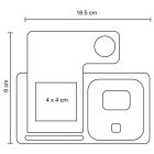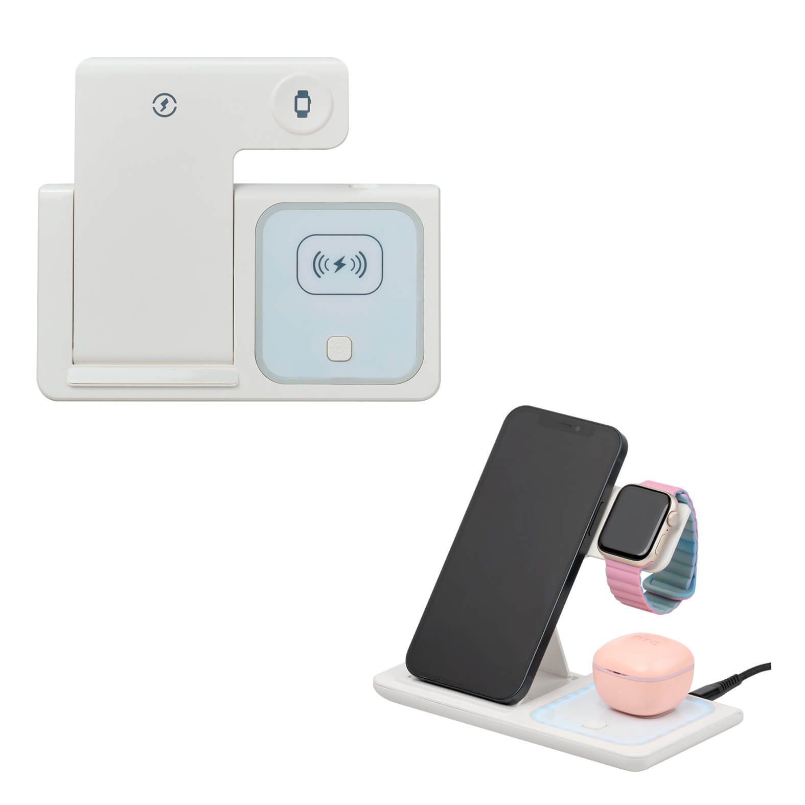 Multicargador inalámbrico plegable 3 en 1 para smartphone, audífonos y reloj inteligente. Cuenta con botón para luz e incluye cable de carga Tipo C. Compatible solo con dispositivos con tecnología Qi.