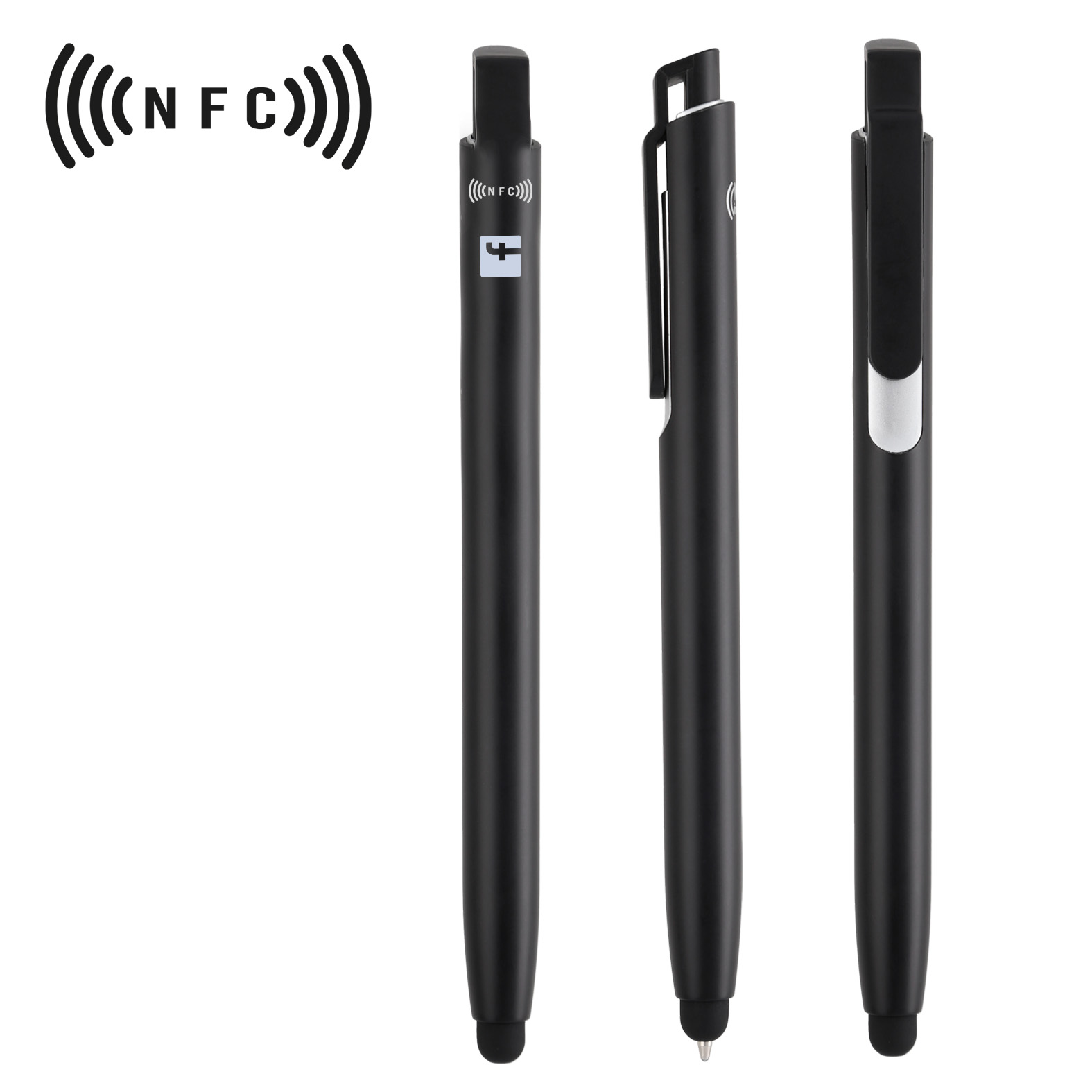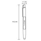 Bolígrafo con etiqueta NFC integrada que puede contener un enlace y es compatible con todos los teléfonos inteligentes NFC. Incluye goma touch screen.