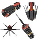 Multi herramienta 8 en 1 con cuerpo de plástico, desarmador, clip y 6 leds, utiliza 3 baterías AAA (no incluidas).