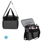 Hielera rectangular con interior impermeable plastificado con cierre, 2 asas, 2 mallas laterales, compartimento frontal y correa ajustable.