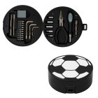 Set de herramientas con print de balón de soccer. Contiene: 1 pinzas, 1 destornillador, 2 extensibles, 5 dados, 10 puntas, 3 llaves Allen y 1 flexómetro.