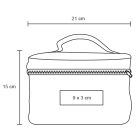 Cosmetiquera de poliéster en forma rectangular con dos compartimientos y asa.