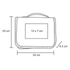 Estuche para viaje de poliéster con 1 compartimento principal con cierre y bolsa al interior, 2 compartimentos con malla, 1 compartimento transparente, gancho de plástico, asa y compartimento trasero.